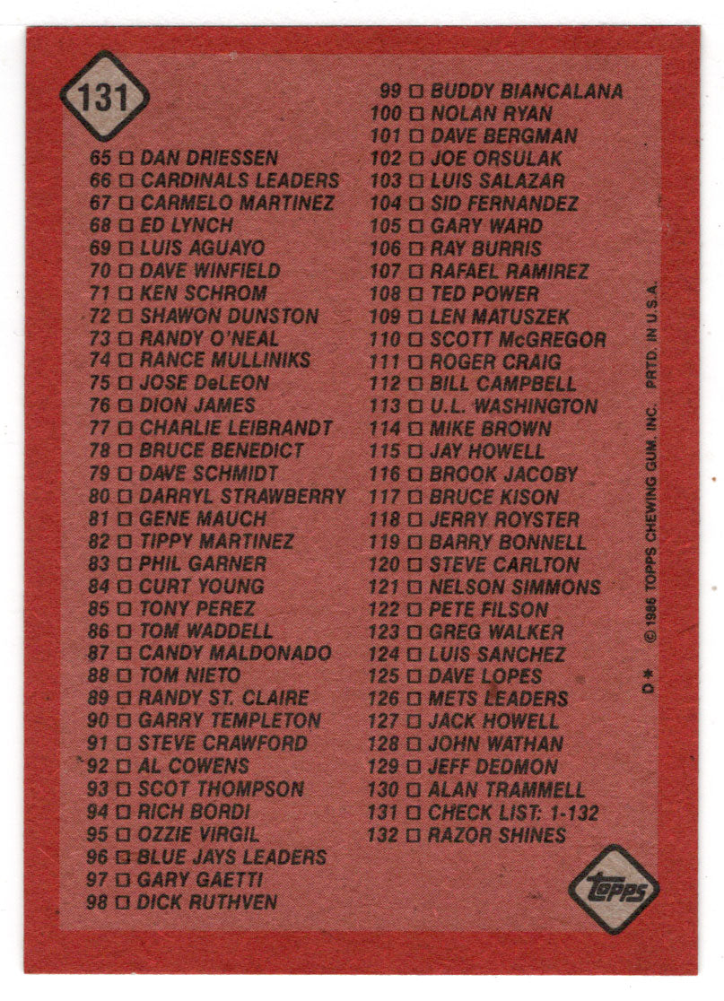 Checklist # 1 (MLB Baseball Card) 1986 Topps # 131 Mint