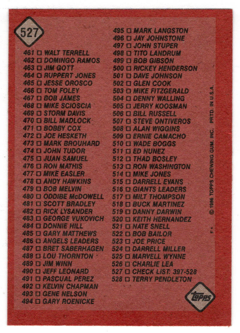 Checklist # 4 (MLB Baseball Card) 1986 Topps # 527 Mint