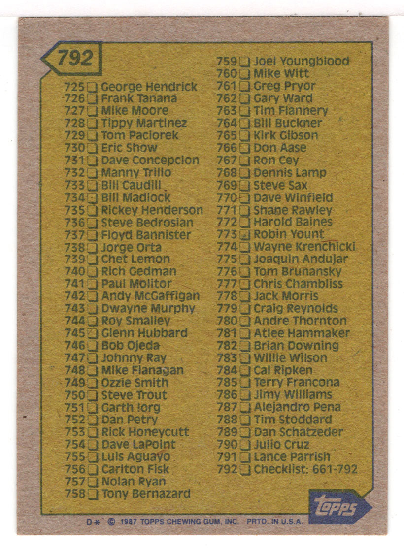 Checklist # 6 (MLB Baseball Card) 1987 Topps # 792 Mint