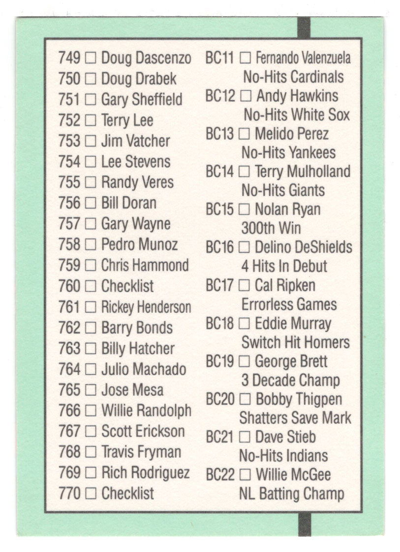 Step up to the plate with this 1991 Donruss Baseball Checklist #10, featuring cards #703 to #770, as well as the Bonus Card #BC1 to #BC22. A must-have for any baseball aficionado or card collector, this set encapsulates the thrill of the Major League Baseball season and offers a snapshot of the game's esteemed history. Proudly manufactured by Donruss, this collection is a tribute to the sport's legends and newcomers of the time. It includes the Base Set with essential player checklists, allowing fans to keep track of their cherished cards. Relive the nostalgia and expand your collection with these classic 1991 baseball trading cards.