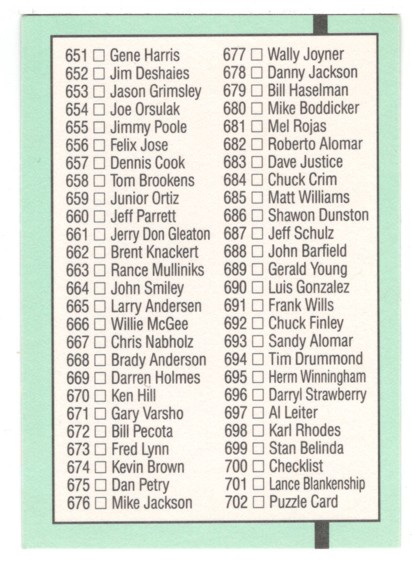 Discover the essence of America's pastime with the 1991 Donruss Baseball Checklist #9, featuring cards #605 through #702. This set offers a nostalgic glimpse into the game's rich history, ideal for collectors and fans alike. The checklist function allows for a comprehensive inventory of your collection, while the base set cards capture memorable moments and players from the Major League Baseball season. Crafted with care by Donruss, a trusted name in sports memorabilia, these cards are a must-have for any baseball enthusiast. The 1991 season is encapsulated in this series, providing a tangible connection to the sport's legacy. Whether for collection or display, these cards are a testament to the timeless appeal of Major League Baseball.