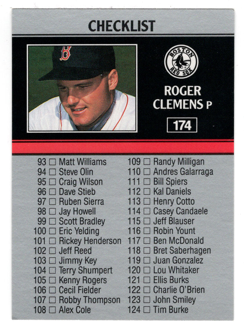 Delve into the world of baseball memorabilia with the 1991 Leaf #174 Roger Clemens checklist card. A must-have for collectors and fans alike, this card features the Boston Red Sox legend and is a valuable piece for those looking to complete their Major League Baseball card sets. Crafted by Leaf Baseball Cards, this item captures the essence of the sport and its storied history. Celebrate a piece of baseball heritage with this classic card from the 1991 season, honoring one of the sport's most dominant pitchers. Perfect for displaying or as a treasured addition to your collection.