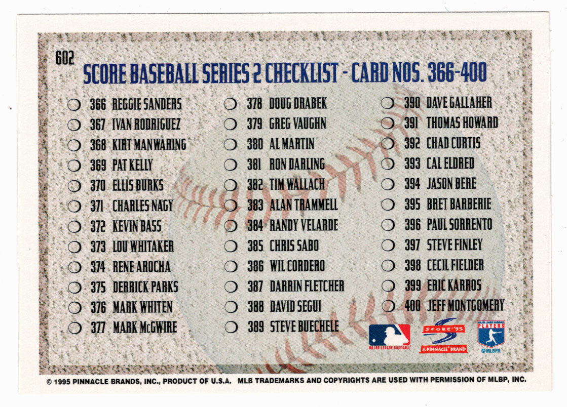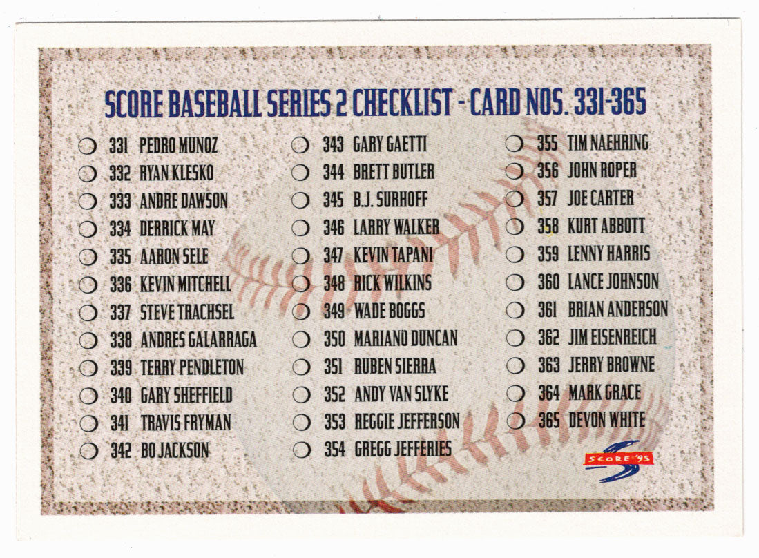 Dive into the nostalgia of America's pastime with the 1995 Score Baseball Card Checklist #331 to #400. A must-have for collectors and baseball enthusiasts, this section of the 1995 Score set features a comprehensive list of the game's icons and rising stars. Each card is a tribute to the athletes who shaped the season, captured in vivid detail and pristine presentation. The collection highlights the Major League Baseball era with a focus on the sport's heritage and ongoing legacy. As part of the base set, these cards boast the authenticity and charm of the period, making them a valuable addition to any collection. The cards also come with the assurance of quality, as all pictures are actual scans, providing a true representation of the items on offer.