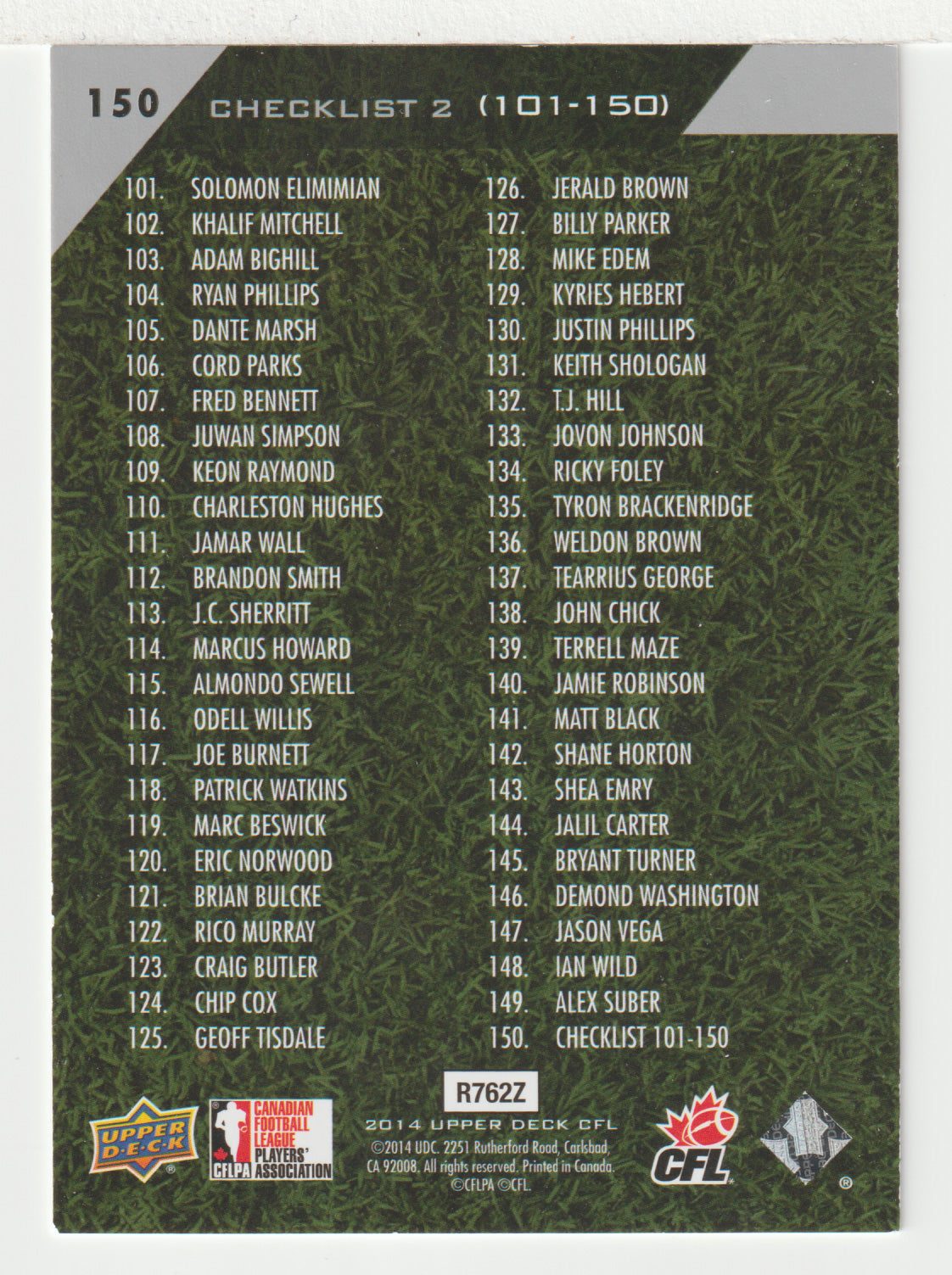 Explore the world of Canadian Football with this 2014 Upper Deck CFL Football Card. Featuring key players from the Calgary Stampeders and Montreal Alouettes, such as Chip Cox and Charleston Hughes, this card is a must-have for enthusiasts and collectors alike. The card, numbered #150 in the set, boasts a crisp image and detailed stats, making it a valuable addition to any collection. Meticulously preserved and scanned, the card includes the base set and checklist features, providing a comprehensive look at the 2014 season. As a genuine piece of sports memorabilia from Upper Deck, it represents the dedication and spirit of the Canadian Football League. Enhance your collection with this piece of football history.