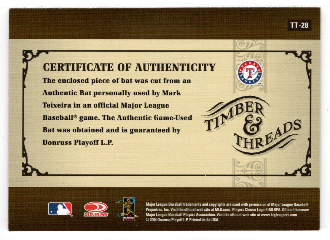 Delve into the world of baseball memorabilia with this Mark Teixeira Bat Card from the 2005 Donruss Timber & Threads set. Representing the Texas Rangers, this insert card, numbered TT-28, captures the essence of the Major League Baseball experience and is a must-have for collectors and fans alike. Crafted by Donruss, a trusted name in sports card manufacturing, this piece celebrates the athletic prowess of Mark Teixeira during the 2005 MLB season. Add a piece of baseball history to your collection with this exceptional 'Bat' card, a tribute to the sport, the player, and the unforgettable season it represents.