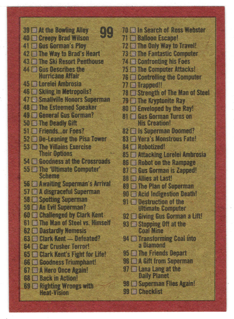 Dive into the world of vintage collectibles with the Superman III trading card checklist from the 1983 Topps set. This particular card, numbered #99, is a must-have for enthusiasts looking to complete their collection or for fans of the iconic superhero who appreciate memorabilia from the classic film. Manufactured by Topps, known for their quality and attention to detail, this non-sport trading card boasts the appeal of the Superman franchise. It's a unique piece of movie history that captures the essence of the era and is an excellent addition to any collection of film memorabilia or vintage cards.