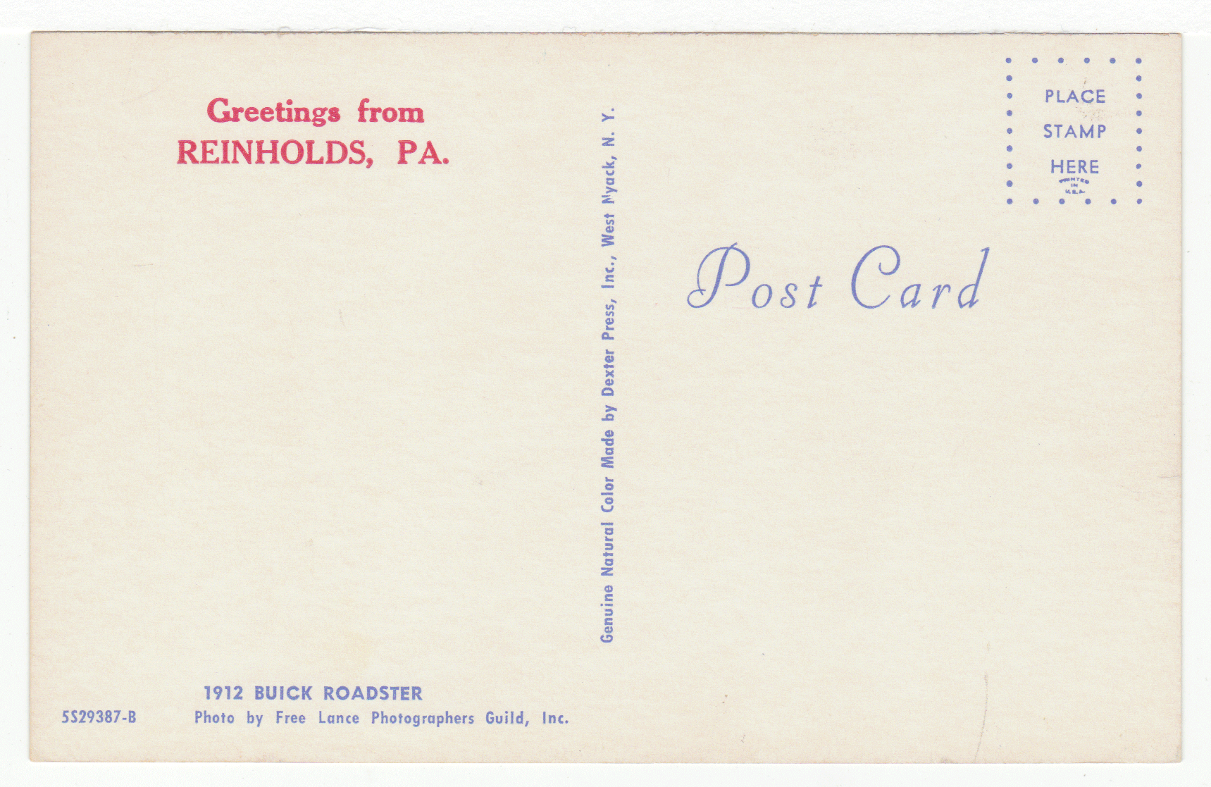 Explore a slice of automotive history with this charming 1912 Buick Roadster postcard, featuring a classic greeting from Reinholds, PA. The lithographic print captures the essence of an early 20th-century car, making it a delightful collectible for enthusiasts of transportation memorabilia. This original piece from the 1980s remains unposted, preserving its vintage allure. Ideal for collectors of car-themed items or those who appreciate the convergence of history and transportation, this single unit postcard is a genuine artifact reflecting the United States' rich heritage in automobile manufacturing.