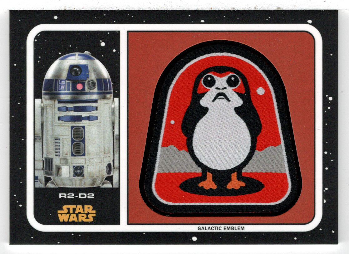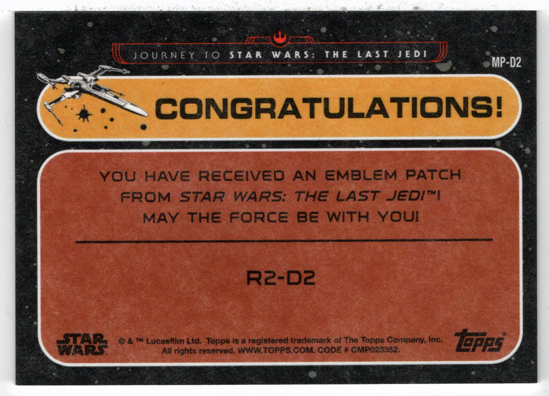Embark on a galactic adventure with the R2-D2 Patch card from the Star Wars: Journey to The Last Jedi collection, a 2017 Topps issue, numbered MP-D2. This collectible features the iconic astromech droid, R2-D2, and is part of the sought-after Galactic Emblem Patch Relics series, adding a unique piece of memorabilia to your Star Wars ensemble. Crafted in the United States, the card showcases an elegant insert design from the non-sport trading card set. It's an essential piece for enthusiasts and collectors alike, capturing the essence of the Star Wars franchise. Remember, all pictures shown are actual scans, providing a true representation of the item you'll receive.